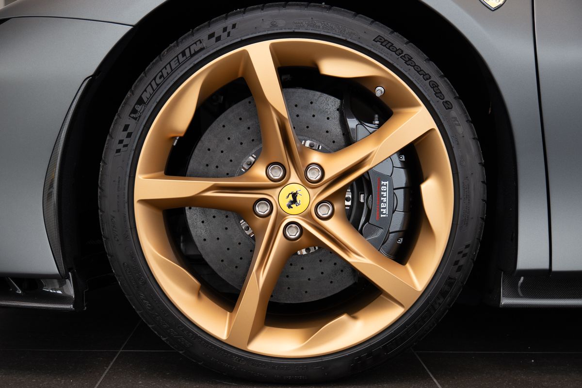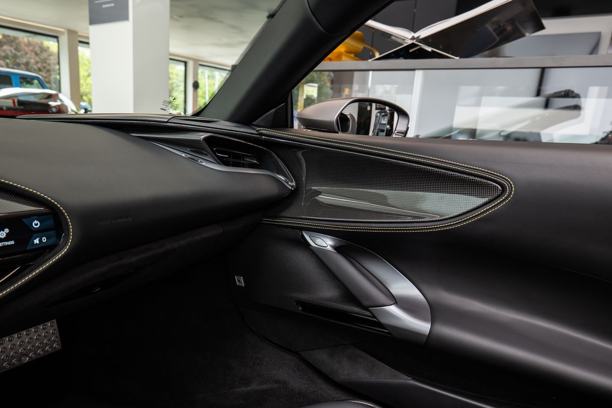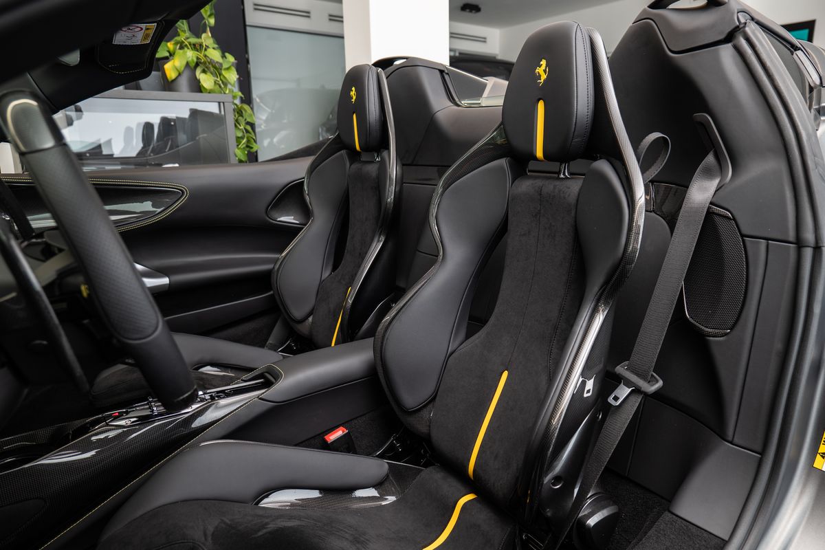 | Doplňující popis: | Přední radar s adaptivním tempomatem, Adaptivní systém předních světlometů, Středová část sedadel v černé Alcantaře, Dvoubarevná karoserie (černá Nero DS 1250), Zadní radar, Brzdové třmeny v barvě Silverstone Grey, Přední spoiler z karbonu, Zadní horní obložení z karbonu, Zadní difuzor z karbonu, Spodní kryt vozu z karbonu, Karbonové zóny na volantu s LED diodami, Karbonový kryt přístrojového panelu, Karbonové výplně dveří, Karbonové prahy dveří s logem Ferrari, Horní část středového tunelu z karbonu, Kožené detaily pro zadní spolujezdce (výbava Extrarange, kůže Giallo 113256), Dekorace „Extrarange“ z kůže Giallo 113256, Aktivované připojení MyFerrari Connect, Karbonové dekory přístrojové desky, Přední zvedání vozu (Front Lift), Vyšitý znak Cavallino na opěrkách hlavy (nití v barvě Giallo 0113), Černé koncovky výfuku, Přední spoiler z karbonu, Navigace a konektivita MyFerrari, Znak „Scuderia Ferrari“ na blatnících, Vnitřní elektrochromatická zpětná zrcátka, Přední a zadní parkovací senzory, Speciální matné barvy (Matte Grigio Silverstone), 20 kovaná kola v tmavém odstínu, Matné zlaté ráfky (Matte Gold), Závodní karbonová sedadla, Zvedák pro závodní použití, Prémiový audiosystém Hi-Fi, Rozšířená personalizace (Atelier), Barevné kontrastní prošívání (nití v barvě Giallo 0113), 360° kamera s funkcí „Surround View“, Titanové šrouby kol | |