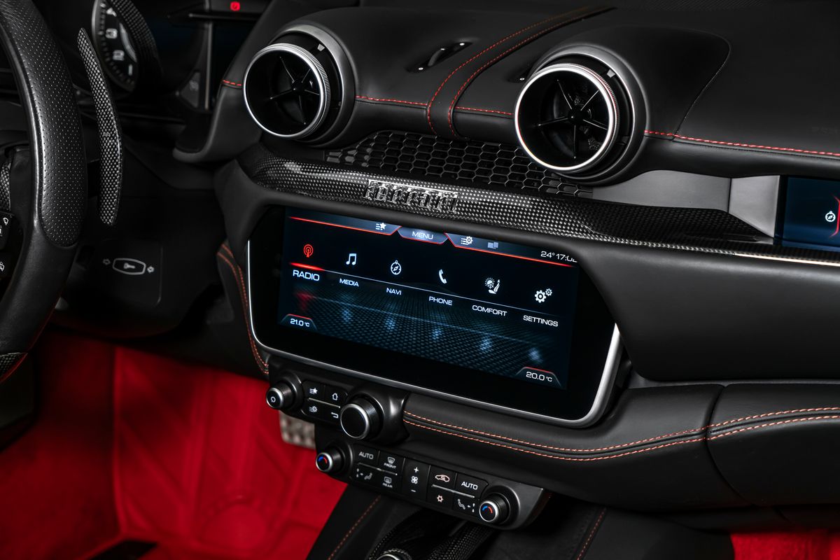 | Doplňující popis: | Ostrava, Příplatková výbava: Příplatky: Žluté brzdové třmeny, Zadní větrací otvory z uhlíkových vláken, Přední větrací otvory z uhlíkových vláken, Řidičova zóna z uhlíkových vláken + LED diody, Kryt spodních dveří z uhlíkových vláken, Středový tunel z uhlíkových vláken, Vnější prahové lišty z uhlíkových vláken, Držák nápojů z uhlíkových vláken, Vložky palubní desky z uhlíkových vláken, Přední spoiler z uhlíkových vláken, Cavallino prošívané na opěrce hlavy, HELE, Emblémy Scuderia Ferrari na blatnících, Dvourežimové odpružení Magneride, Elektrochromatické zpětné zrcátko, Přední a zadní parkovací kamera, Displej spolujezdce, 20 kované ráfky, Plně elektrická sedadla, Sklopné opěradlo zadních sedadel, JBL, Speciální výbava, Barevné prošívání standart - rosso; | |
