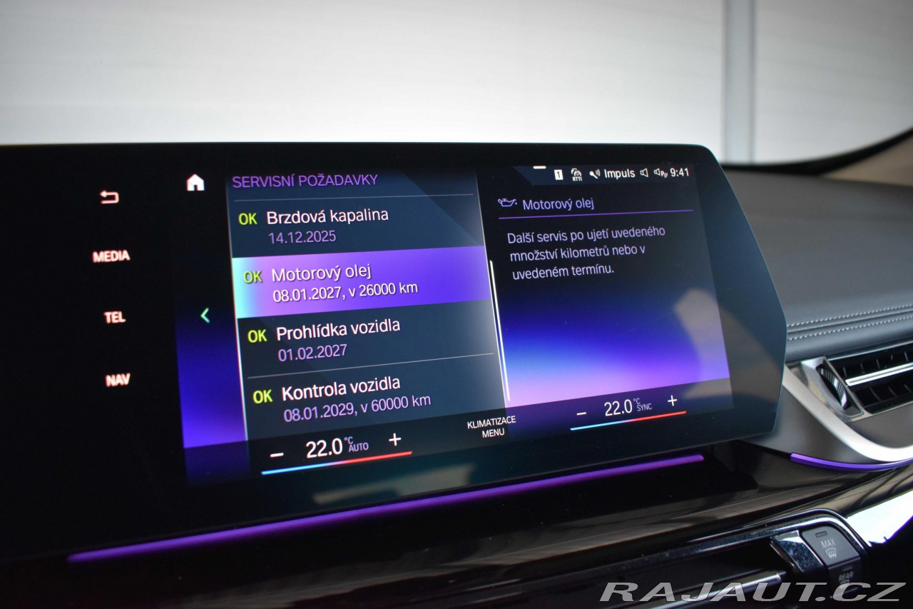 | Doplňující popis: | Vozidlo registrované jako nové v ČR od 1. majitele, s možností odpočtu DPH. Pravidelně servisováno v tovární záruce BMW do 2/2026, poslední servisní interval proveden před 4 000 km, historie vozidla prověřena společností CEBIA, na vyžádání lze zaslat Cebia report mailem, z volitelné výbavy: Innovations Paket, Paket Travel, Paket xLine, Paket zrcátek, Asistent dálkových světlometů, BMW Head-Up Display, BMW Live Cockpit Professional, Driving Assistant Professional, Elektricky nastavitelné sedadlo řidiče včetně pamětí, Elektricky ovládané tažné zařízení, Zvětšená palivová nádrž (+ 10 l), Vnitřní zpětné zrcátko s automatickým zacloňováním, Nastavitelná zadní sedadla, Vyhřívání předních sedadel, Adaptivní LED světlomety, Panoramatické, elektricky ovládané skleněné střešní okno, Parking Assistant Plus, Zvýšená protisluneční ochrana oken (od B-sloupku), Přihrádka pro bezdrátové nabíjení, Komfortní přístupový systém. Tato nabídka má pouze informativní charakter a neslouží jako podklad pro uzavření objednávky. STOP CARS s.r.o. si vyhrazuje právo uzavření všech smluvních vztahů písemně. | |