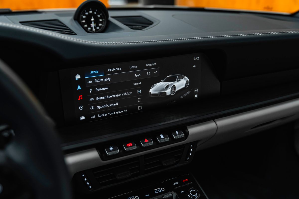 | Doplňující popis: | Bratislava, Porsche 911 Targa 4 GTS T - Hybrid Exteriér a dizajn Odstránenie označenia modelu Exkluzívny dizajn uzáveru palivovej nádrže Odstránenie log „GTS“ z dverí Tónované (zatemnené) sklá Čelné sklo so sivým vrchným tónovaním Tónované hlavné LED svetlomety s HD-Matrix technológiou LED osvetlenie dverí s logom PORSCHE Interiér a komfort Opláštenie stĺpika riadenia v koži (s pamäťovým balíkom) Vyhrievaný športový volant GT v koži Adaptívne športové sedadlá Plus (18-smerovo elektricky nastaviteľné) s pamäťovým balíkom Ventilácia predných sedadiel Kožený obklad držiakov na nápoje Personalizované kľúče vo farbe karosérie s puzdrom v zodpovedajúcom dizajne Bezpečnostné pásy v odtieni Crayon (svetlosivá) Úložná sieť v priestore pre nohy spolujazdca Asistenčné systémy a bezpečnosť Asistent zmeny jazdného pruhu 360° kamerový systém Surround View s aktívnou podporou parkovania Príprava na Porsche Dashcam HomeLink® (otvárač garážových dverí) Power Steering Plus – variabilné posilňovanie riadenia Systém zdvíhania prednej nápravy Pohodlie a funkčnosť Comfort Access – bezkľúčový vstup a štartovanie Súprava na opravu defektu: tesniaca hmota a elektrický kompresor Lekárnička Audio a infotainment BOSE® Surround Sound System Interiérové detaily Znak Porsche vytlačený (embosovaný) na opierkach hlavy | |