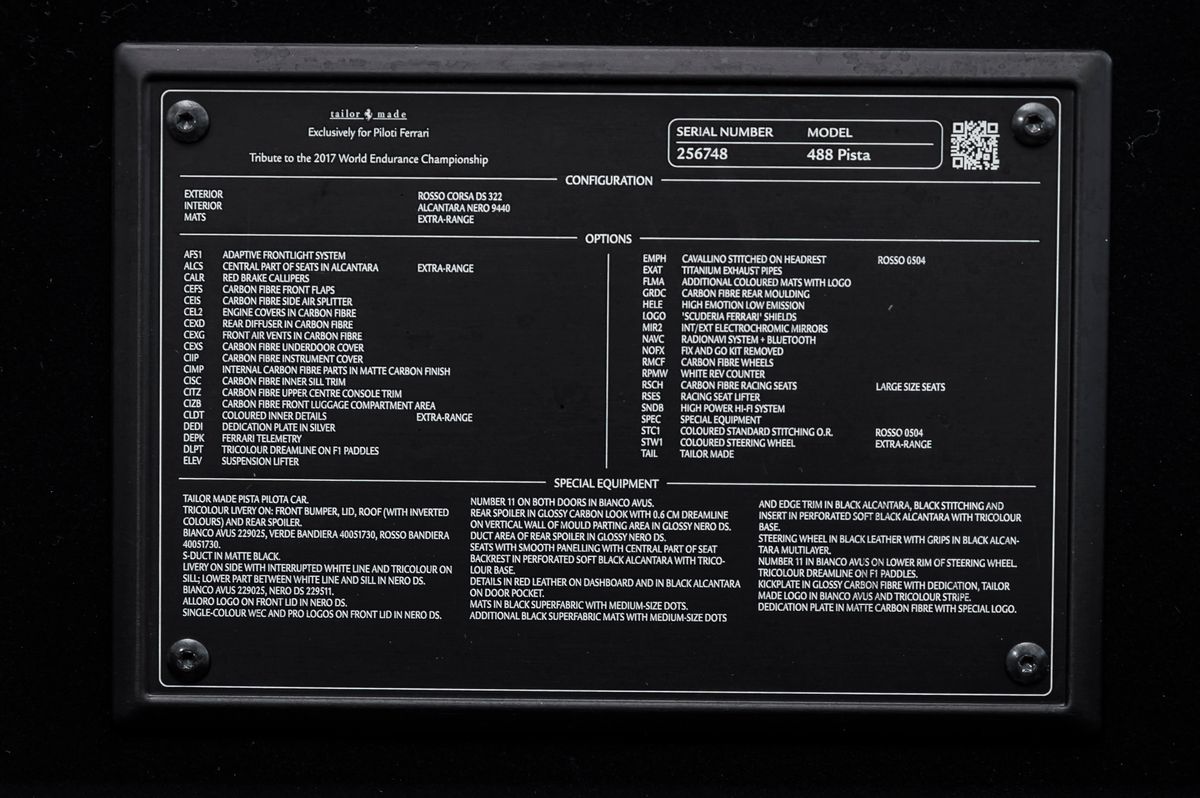 | Doplňující popis: | Listing number: ZL.273.6748, Full body transparent PPF wrap, Exterior in Rossor Corsa, Interior in Alcantara Nero, Tailor Made Pista Pilota Car, Tricolour Livery, Suspension Lifter, Carbon Fibre Wheels, Cavallino Stitched On Headrest / Rosso, Titanium Exhaust Pipes, 'Scuderia Ferrari' Shields, Int/Ext Electrochromic Mirrors , Radio Navi System + Bluetooth, White Rev Counter, Carbon Fibre Racing Seats / Large Size Seats, Racing Seat Lifter, High Power Hi-fi System, Coloured Standard Stitching Rosso, Coloured Steering Wheel, Adaptive Frontlight System, Central Part Of Seats In Alcantara, Red Brake Callipers, Carbon Fibre Front Flaps, Carbon Fibre Side Air Splitter, Engine Covers In Carbon Fibre, Rear Diffuser In Carbon Fibre, Carbon Fibre Rear Moulding, Front Air Vents In Carbon Fibre, Carbon Fibre Underdoor Cover, Carbon Fibre Instrument Cover, Internal Carbon Fibre Parts In Matte Carbon Finish, Carbon Fibre Inner Sill Trim, Carbon Fibre Upper Centre Console Trim, Carbon Fibre Front Luggage Compartment Area, Coloured Inner Details, Dedication Plate In Silver, Ferrari Telemetry, Tricolour Dreamline On F1 Paddles, | |