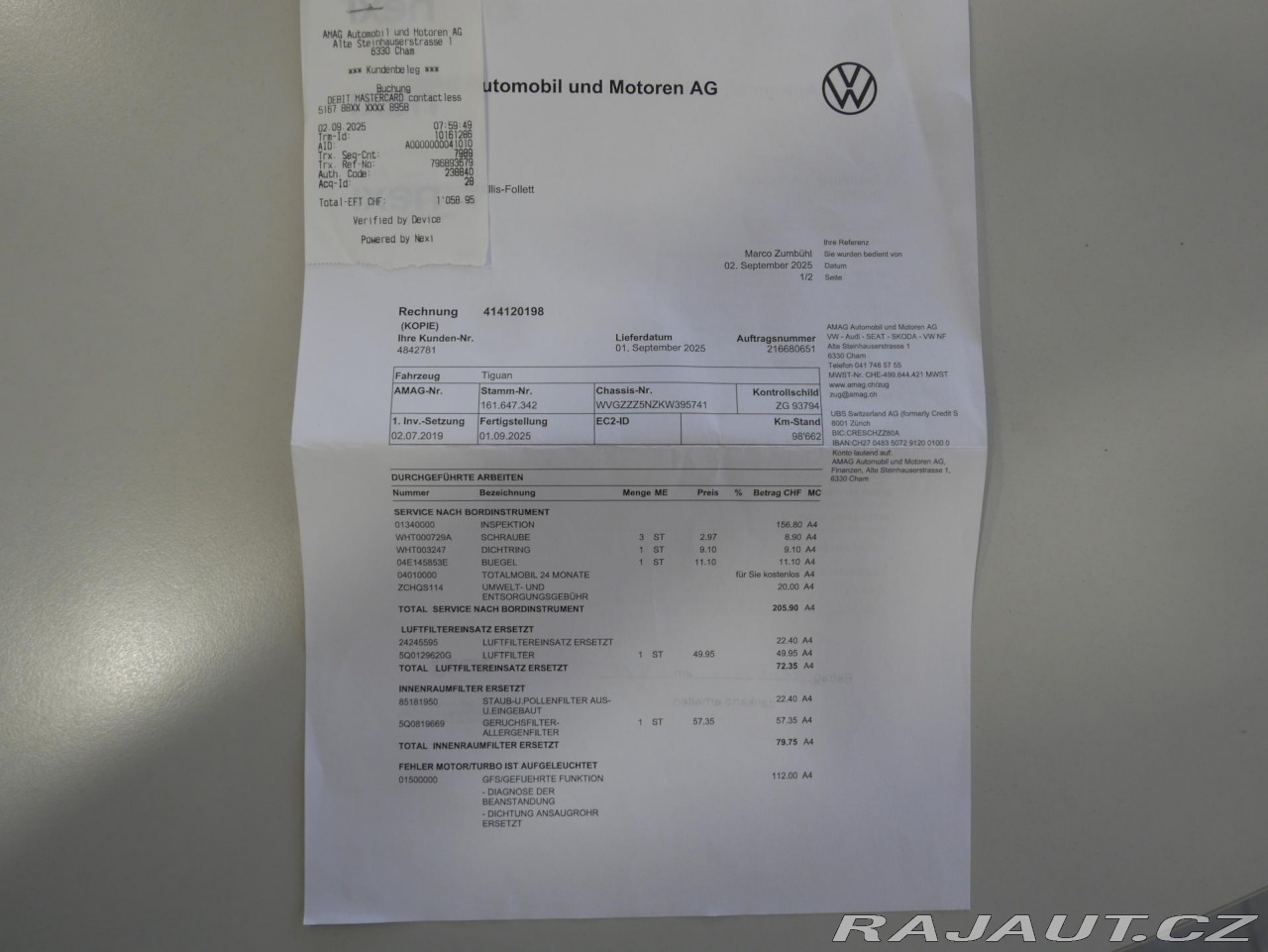 | Doplňující popis: | Výhodné financování od 0,Kč ! Ke každému vozidlu dárek ! Atraktivní provedení VW Tiguan 1,5 TSI Evo IQ.Drive 96kW/131PS ! 6 Rychlostních stupňů, 7x Airbag, Deaktivace airbagu spolujezdce, Satelitní navigace, Stereo s CD, USB, Bluetooth, Paměťová karta, Apple Car Play, Android Auto, Hands Free, Vyhřívaná sedadla, Isofix, Automatická dvouzonová klimatizace, Klimatizovaná přihrádka, Ambientní osvětlení interiéru, Elektrická okna, Elektricky ovládaná vyhřívaná a sklopná zrcátka, Adaptivní tempomat, Přední a zadní parkovací senzory, Parkovací asistent, Automatické parkování, Senzor stěračů, Senzor světel, Start/Stop systém, Alu kola a další..! Vozidlo pravidelně servisováno v autorizovaném servisu VW ! Poslední servis 01.09.2025 v 98662km ! VELMI PĚKNÉ AUTO S MOŽNOSTÍ ODPOČTU DPH !; | |