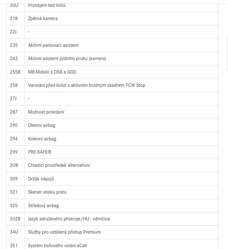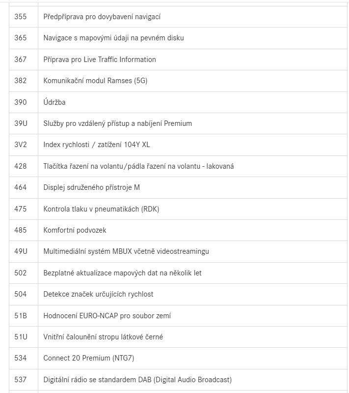 | Nadstandardní výbava: | aut. převodovka, 8x airbag, ABS, brzdový asistent, stabilizace podvozku (ESP), protiprokluzový systém kol (ASR), nouzové brzdění (PEBS), asistent rozjezdu do kopce (HSA), ukazatel rychlostního limitu (SLIF), hlídání jízdního pruhu, asistent jízdy v jízdním pruhu, sledování únavy řidiče, posilovač řízení, dvouzónová klimatizace, aut. klimatizace, nezávislé topení, nezávislé topení s čas. předehřívačem, adaptivní tempomat, LED adaptivní světlomety, LED denní svícení, alu kola, palubní počítač, hlasové ovládání palubního počítače, dotykové ovládání palubního počítače, digitální přístrojový štít, volba jízdního režimu, elektronická ruční brzda, satelitní navigace, parkovací senzory přední, parkovací senzory zadní, parkovací asistent, parkovací kamera, senzor světel, senzor stěračů, nastavitelný volant, multifunkční volant, deaktivace airbagu spolujezdce, hands free, bluetooth, el. okna, el. sklopná zrcátka, el. zrcátka, samostmívací zrcátka, imobilizér, centrál dálkový, centrální zamykání, potahy kůže, isofix, kožené čalounění, ambientní osvětlení interiéru, vyhřívaná sedadla, výškově nastavitelná sedadla, polohovací sedadla, senzor tlaku v pneumatikách, senzor opotřebení brzdových destiček, přední světla LED, zadní světla LED, mlhovky, USB, autorádio, digitální příjem rádia (DAB), venkovní teploměr, zadní loketní opěrka, vnitřní teploměr, zadní stěrač, tónovaná skla, zatmavená zadní skla, digitální přístrojová deska, | |
