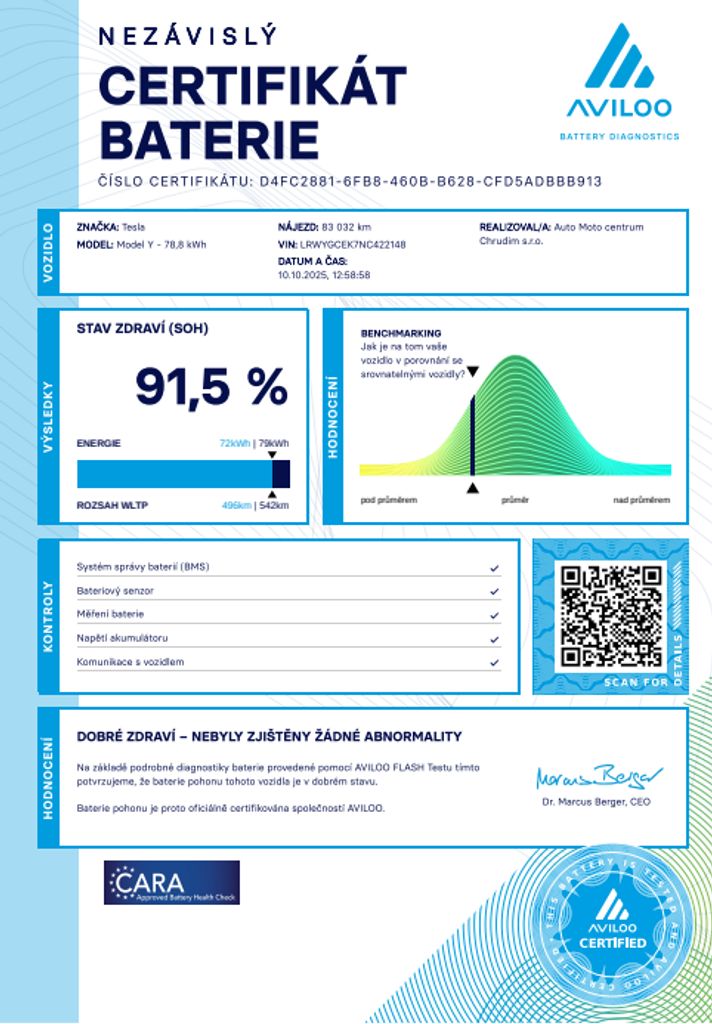 | Doplňující popis: | Tesla Model Y Long Range 378kW SOH 91, 5% (ODPOČET DPH) - cena uvedena vč. DPH, baterie 78, 8 kWh - LRWYGCEK7NC422148, dovoz: EU, elektro, do provozu: 1.9.2022, najeto: 83032 km, pohon kol: 4x4, automatická převodovka, STK do: 10/2027, vyhřívaná přední i zadní sedadla, vyhřívaný volant, parkovací kamera, procesor AMD RYZEN, tepelné čerpadlo, WLTP 560 km. Záruka na Akumulátor a hnací ústrojí 8 let nebo po ujetí 192.000 km (podle toho, co nastane dříve). *MOŽNOST VYKOUPENÍ VAŠEHO STARÉHO VOZU PROTIÚČTEM* *MOŽNOST VÝHODNÉHO FINANCOVÁNÍ už bez nulové akontace* Pro nezávaznou kalkulaci nás neváhejte kontaktovat. Nutno vždy volat předem! Prohlídky možné i mimo pracovní dobu tel. 732710796 Mates auto. Nejedná se o návrh na uzavření smlouvy (nabídku) dle § 1731 zákona č. 89/2012 Sb., občanský zákoník, ale o nezávaznou nabídku., | |