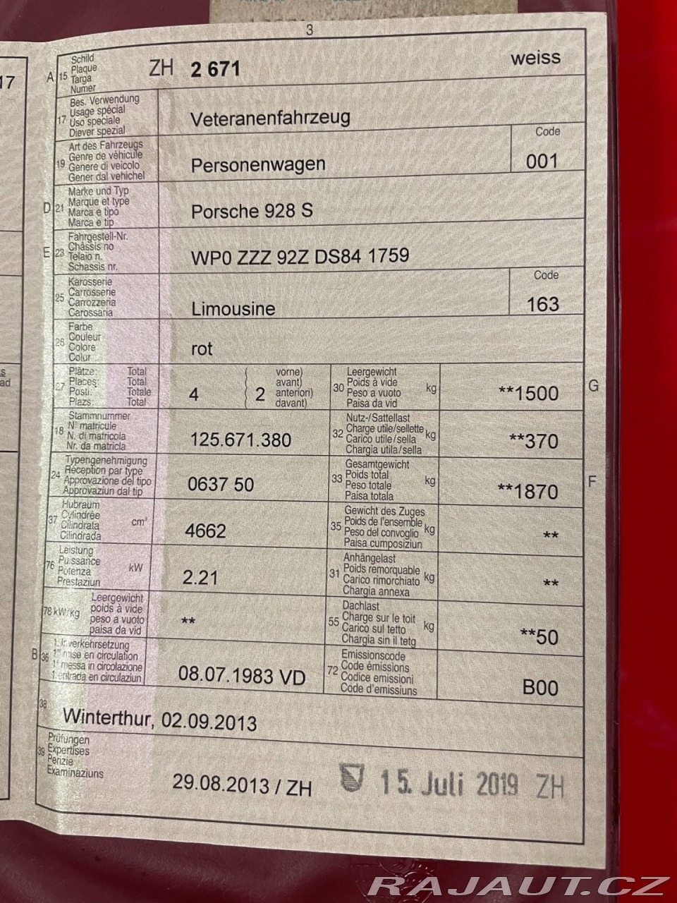 | Doplňující popis: | PORSCHE 928 S r.v 10/1983, stav 129´000km, obsah 4'664 cm³, výkon 310PS (228kW), manuální převodovka, velmi dobře udržovaný, pouze letní provoz, garance počtu km, první majitel, momentálně není potřeba žádný servis, vše doloženo účty celkově za 500tis Kč za celou historii.Velmi zajímavá zajímavá a vyjímečná technika V8. Dovezeme ze Švýcarska a cena je včetně DPH, cla, podrobné prohlídky, vyřízení celního řízení a dovozu. Podle prvotní informace je auto v TOP stavu ale ještě jsme ho neviděli nemůžeme potvrdit takže to berte s rezervou. Díky malé rozloze a rozmanitosti terénu a kvalitních silnic a servisu bývají vozy ve velmi dobrém stavu. Využijte poměrně příznivého kurzu CHF/CZK. V případě dotazů volejte nebo pište. Díky. | |