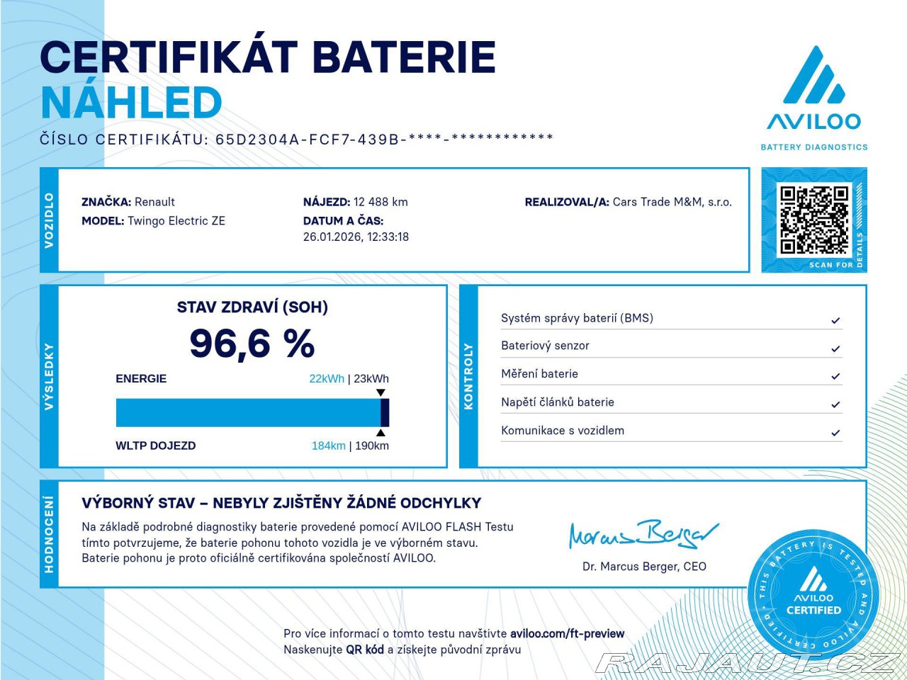 | Doplňující popis: | Na vozidle proběhla nezávislá kontrola baterie s výsledkem 96,6%SoH. Možnost dokoupení záruky na všechny součástky až na 48 měsíců. 100% garance na počet ujetých kilometrů. Prověřené vozy společností Cebia s možností nahlédnutí do výpisu Cebia Reportu. Dále si také můžete nechat prověřit vůz vlastním mechanikem či autorizovaným servisem. Vůz původem z Německa po 1. majiteli. Tato nabídka není návrh na uzavření kupní smlouvy dle zákona 89/2. | |