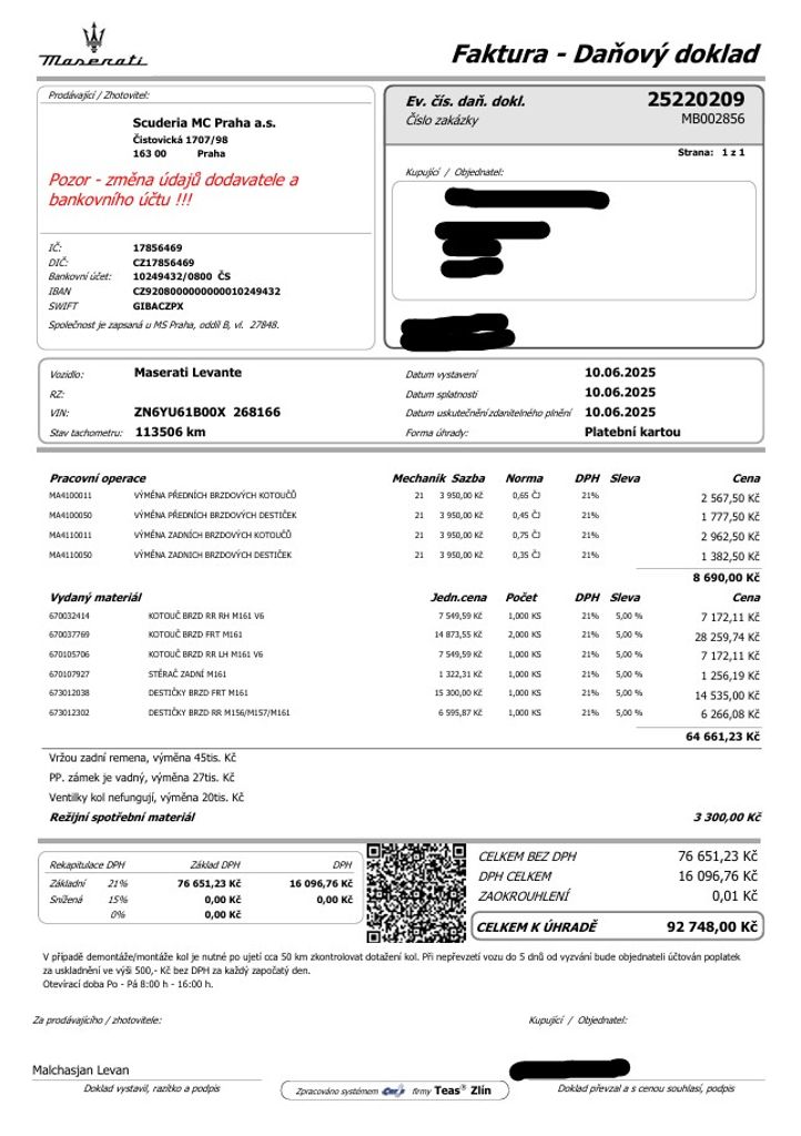 | Doplňující popis: | Maserati Levante S 3.0 316 kW - benzín, automatická převodovka, pohon kol: 4x4, do provozu: 20.11.2018, přihlášeno v ČR, najeto: 116043 km, STK + EMISE do: 10/2026, vyhřívaná přední i zadní sedadla, navigace, HARMAN/KARDON, SOFT CLOSE, DRUHÁ SADA ORIGINÁLNÍCH KOL - LETNÍ, PŘEDNÍ A ZADNÍ PARKOVACÍ KAMERA, SENZORY, servisní faktura - NOVÉ PŘEDNÍ/ZADNÍ KOTOUČE + DESTIČKY. *MOŽNOST VYKOUPENÍ VAŠEHO STARÉHO VOZU PROTIÚČTEM* *MOŽNOST VÝHODNÉHO FINANCOVÁNÍ už bez nulové akontace* Pro nezávaznou kalkulaci nás neváhejte kontaktovat. Nutno vždy volat předem! Prohlídky možné i mimo pracovní dobu tel. 732710796 Mates auto. Nejedná se o návrh na uzavření smlouvy (nabídku) dle § 1731 zákona č. 89/2012 Sb., občanský zákoník, ale o nezávaznou nabídku., | |