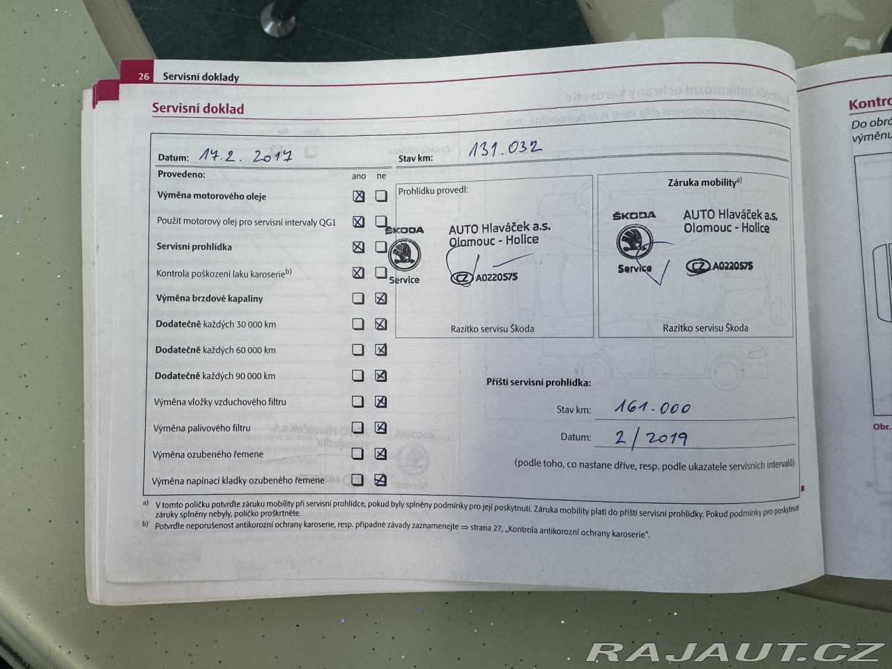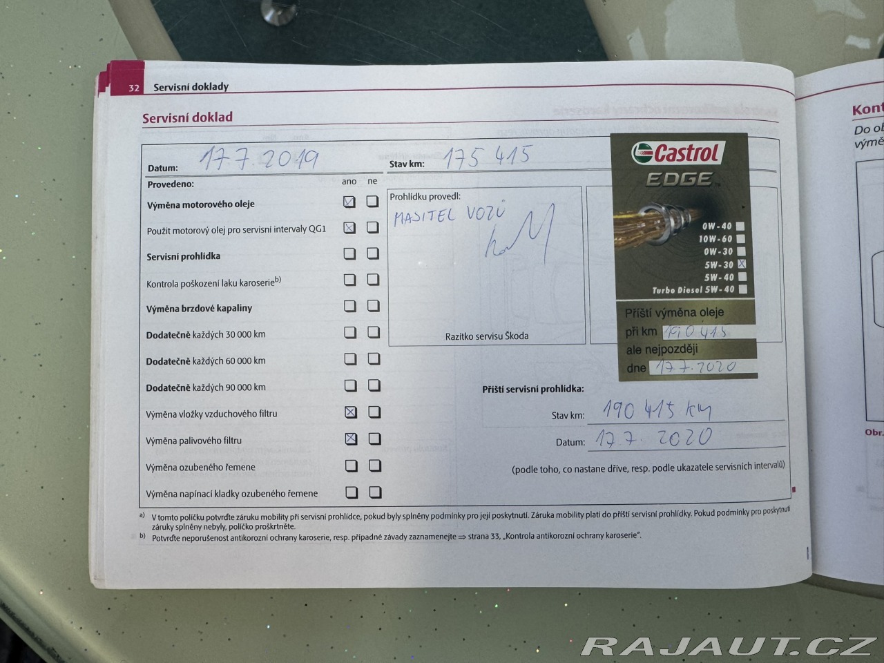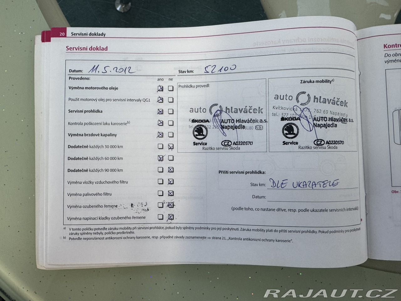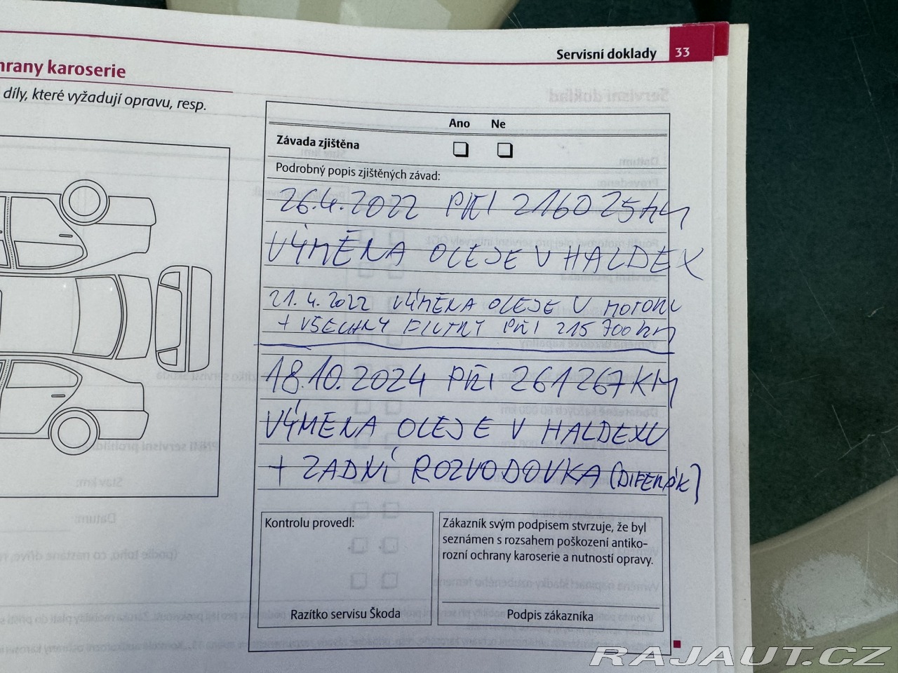 | Doplňující popis: | DRUHÝ MAJITEL, 4X4, DVA KLÍČE+ZAMYKÁNÍ ZPÁTEČKY, SERVISNÍ KNIHA, VÝMĚNA ROZVODŮ PŘI 150 TKM, VŮZ BY NĚMĚL BÝT BOURANÝ, NOVÝ FILTR PEVNÝCH ČÁSTIC(DPF) Z ROKU 2020+FA, OŠETŘENÍ PODVOZKU, PRAVIDELNÁ VÝMĚNA OLEJE VE 4X4, MOTOROVÝ OLEJ MĚNĚN DO 15 TKM, ZÁNOVNÍ BRZDY, NOVÝ EGR VENTIL Z 12/2025, FUNKČNÍ KLIMATIZACE, VÝHŘEV VŠECH SEDADEL, 2X LOKET. OPĚRKA, AUTOMATIKA, TEMPOMAT, BLUETOOTH, PALUBNÍ PC, MULTIFUNKCE, NĚKOLIK FA ZA SERVIS, ZÁNOVNÍ STK DO 11/2027, PŘI PRODEJI POMOHU S POJIŠTĚNÍM, K DISPOZICI CEBIA REPORT. Najeto: 278 174 km Vyrobeno: 2009 V provozu od: 12/2009 VIN: TMBKE61Z9A2070502 Klimatizace: Dvouzónová automatická Počet airbagů: 6 Počet dveří: 5 Počet míst:5 Palivo: Nafta Objem: 1 968 ccm Výkon: 103 kW (140 koní) Převodovka: Manuální Převodový stupeň: 6 stupňová Pohon: 4×4 EURO 5 Serv. knížka: Ano Země původu: Česká republika STK: 11/2027 ABS Airbag 6x Automatická uzávěrka diferenciálu Autorádio Bluetooth Centrální zamykání Dálkové centrální zamykání Dělená zadní sedadla El. ovládání oken El. ovládání zrcátek ESP Imobilizér Isofix Klimatizace aut. Klimatizace dvouzónová Litá kola Mlhovky Multifunkční volant Nastavitelná sedadla Nastavitelný volant Originální autorádio Palubní počítač Parkovací senzory zadní Podélný posuv sedadel Posilovač řízení Protiprokluzový systém kol (ASR) Senzor opotřebení brzd. destiček Senzor stěračů Tempomat Venkovní teploměr Vyhřívaná sedadla Vyhřívaná zadní sedadla Vyhřívaná zrcátka Výsuvné opěrky hlav Výškově nastavitelná sedadla Zadní loketní opěrka Zadní stěrač | |