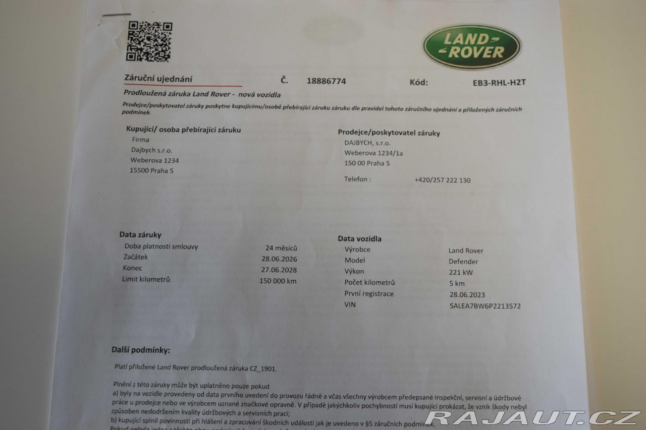 | Doplňující popis: | Vozidlo registrované jako nové v ČR, vůz v tovární záruce do 27.6 2028 nebo 150 000 km, s možností odpočtu DPH. Pravidelně servisováno v autorizovaném servise, poslední servisní interval proveden v únoru 2026. Historie vozidla prověřena společností CEBIA, na vyžádání lze zaslat Cebia report mailem. Z volitelné výbavy: Cold Climate pack, Driver Assist pack, Comfort and Convenience Pack, Advanced Off-Road Capability Pack, El. aktivní diferenciál, Světla LED MATRIX, Air suspension a další. Tato nabídka má pouze informativní charakter a neslouží jako podklad pro uzavření objednávky. STOP CARS s.r.o. si vyhrazuje právo uzavření všech smluvních vztahů písemně. | |