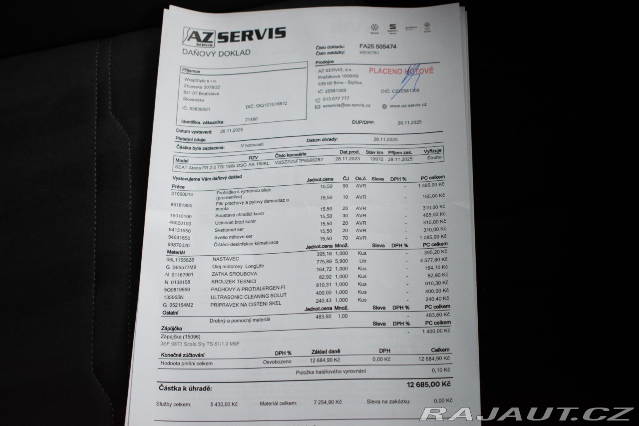 | Doplňující popis: | Vozidlo registrované jako nové na Slovensku od 1.majitele, celý vůz polepen ochranou matnou PPF folií, s možností odpočtu DPH. Pravidelně servisované, poslední servisní interval proveden před 1 100 km. Historie vozidla prověřena společností CEBIA, na vyžádání lze zaslat Cebia report mailem. Z volitelné výbavy: Winter package, TOP LED taillights, Small leather package (3 spoke heated multif. leather steer. wheel for radio, tel.,gearbox AG shifting)(for RS sport), "Park Assist", Comfort Seat Plus (LHD), Businessline plus pack Style, Asistent pro vedení v jízdním pruhu plus Emergency Assist a asistent pro jízdu v zácpě, "KESSY", Adaptivní omezovač (w/ "Follow-to-Stop") a omezovač rychlosti, Centrální zamykání "Keyless-Entry" s dálkovým ovládáním, Vyhřívání předních sedadel s oddělenou regulací, Kožený multifunkční volant, vyhřívaný s Tiptronic, Uzávěrka diferenciálu ( XDS ) dynamická trakční pomoc, Sportovní výbava, Digitální radiopříjem, Asistent návěsu s kontrolou vzdálenosti při parkování, Osvětlovací paket Ambiente provedení 2, Nezávislé topení s dálkovým ovládáním, Elektricky nastavitelné levé sedadlo s pamětí, Mikroklimatické sklo, Čelní asistent včetně City ANB pro aktivní tempomat high. Tato nabídka má pouze informativní charakter a neslouží jako podklad pro uzavření objednávky. STOP CARS s.r.o. si vyhrazuje právo uzavření všech smluvních vztahů písemně. | |