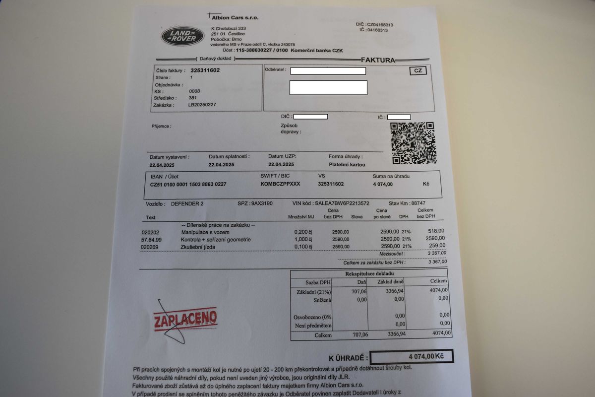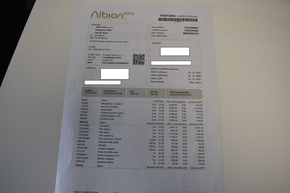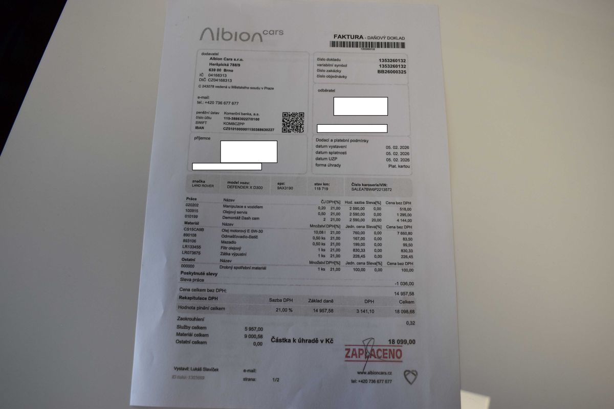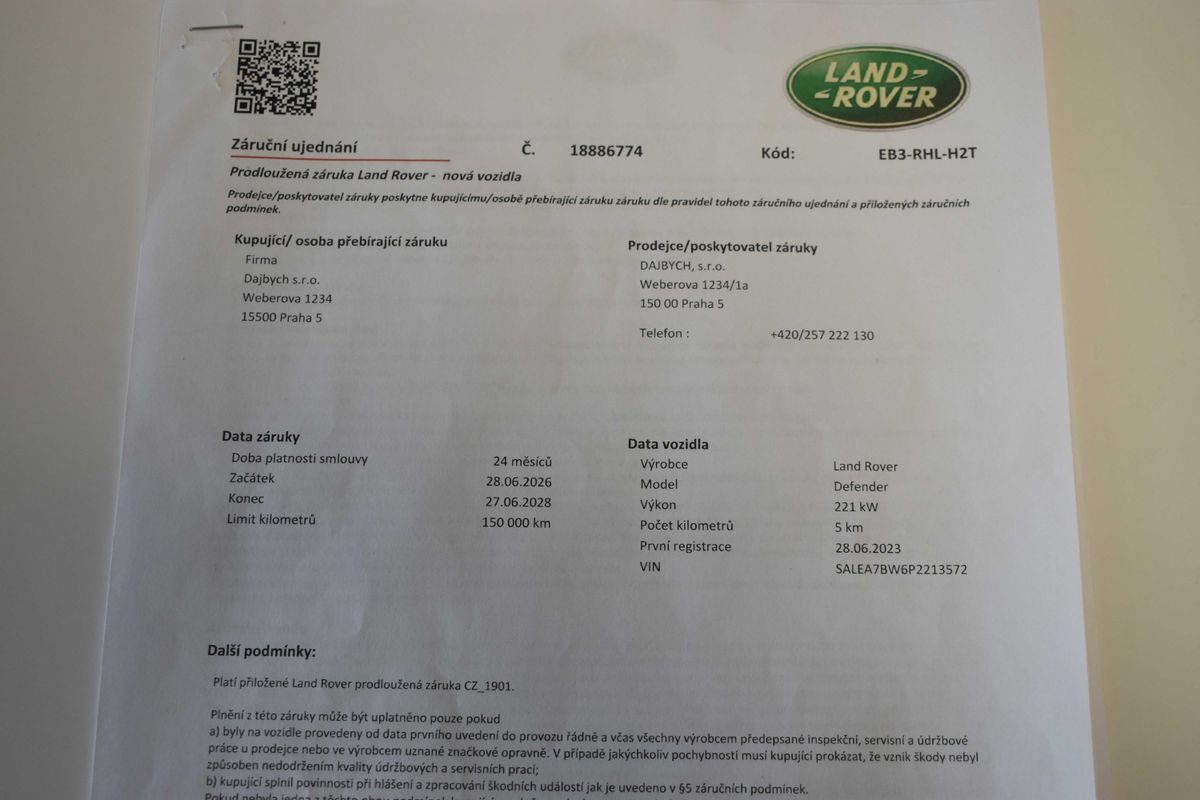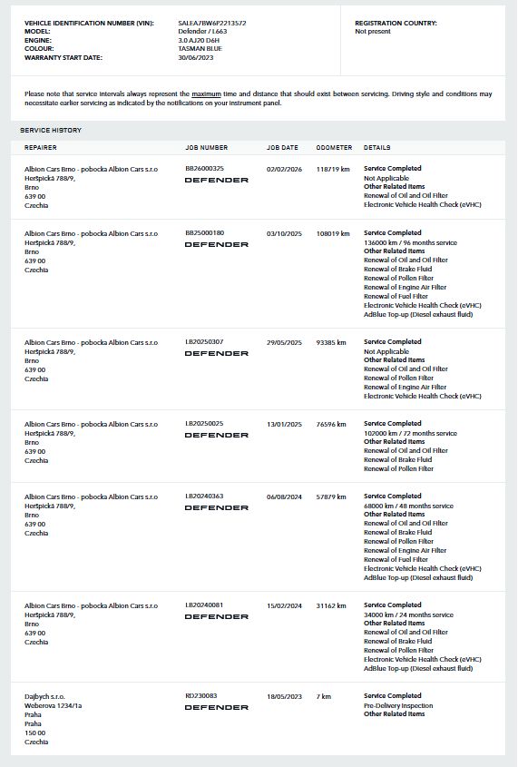 | Doplňující popis: | Vozidlo registrované jako nové v ČR, vůz v tovární záruce do 27.6 2028 nebo 150 000 km, s možností odpočtu DPH. Pravidelně servisováno v autorizovaném servise, poslední servisní interval proveden v únoru 2026. Historie vozidla prověřena společností CEBIA, na vyžádání lze zaslat Cebia report mailem. Z volitelné výbavy: Cold Climate pack, Driver Assist pack, Comfort and Convenience Pack, Advanced Off-Road Capability Pack, El. aktivní diferenciál, Světla LED MATRIX, Air suspension a další. Tato nabídka má pouze informativní charakter a neslouží jako podklad pro uzavření objednávky. STOP CARS s.r.o. si vyhrazuje právo uzavření všech smluvních vztahů písemně. | |