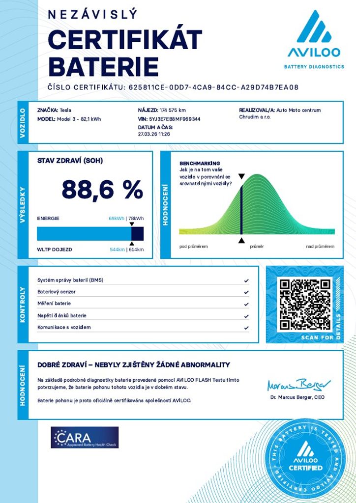 | Doplňující popis: | Tesla Model 3 Long Range Dual Motor - 366kW SOH 88, 6% (ODPOČET DPH) - cena uvedena vč. DPH, baterie 82, 1 kWh, dovoz: Německo, VIN: 5YJ3E7EB8MF969344, elektro, do provozu: 10.6.2021, najeto: 174574 km, pohon kol: 4x4, automatická převodovka, STK do: 3/2028, WLTP 614 km, procesor INTEL ATOM, MATRIX SVĚTLOMETY, BOOM BOX, klimatizace, parkovací kamera, přední a zadní vyhřívaná sedadla, vyhřívaný volant. Záruka na Akumulátor a hnací ústrojí 8 let nebo po ujetí 192.000 km (podle toho, co nastane dříve).*MOŽNOST VYKOUPENÍ VAŠEHO STARÉHO VOZU PROTIÚČTEM* *MOŽNOST VÝHODNÉHO FINANCOVÁNÍ už bez nulové akontace* Pro nezávaznou kalkulaci nás neváhejte kontaktovat. Nutno vždy volat předem! Prohlídky možné i mimo pracovní dobu tel. 732710796 Mates auto. Nejedná se o návrh na uzavření smlouvy (nabídku) dle § 1731 zákona č. 89/2012 Sb., občanský zákoník, ale o nezávaznou nabídku., | |