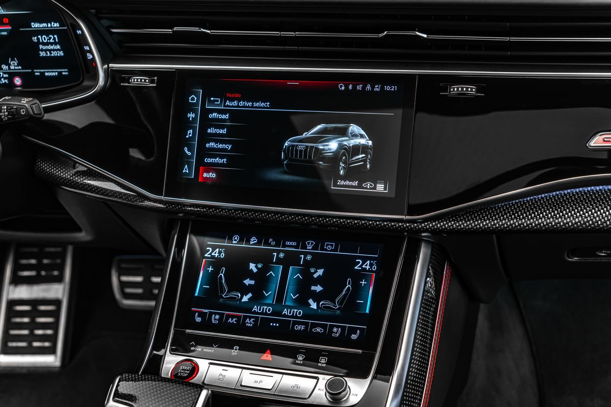 | Doplňující popis: | Ostrava; Speciální výbava: Asistenční balíček Parkování s asistentem dálkového parkování, asistenční balíček Tour, loga a nápisy Audi v lesklé černé barvě, rozhraní Audi Smartphone Interface, elektricky nastavitelné, vyhřívané a sklopitelné vnější zrcátka s automatickým stmíváním a pamětí, handsfree systém Bluetooth s rozpoznáváním hlasu (Audi Phone Box), brzdové třmeny lakované červeně, balíček Carbon Style, střešní ližiny černé, zabezpečení kol proti krádeži (zámky ráfků), LED osvětlení nástupních prostorů s projekční funkcí, asistenční systém: asistent změny jízdního pruhu (Side Assist) včetně Audi pre sense rear, HD Matrix LED světlomety, head-up displej, vnitřní výbava: dekorativní vložky z karbonu, vnitřní výbava: rozšířené prvky interiéru v kůži, vnitřní výbava: červené prošívání, komfortní klíč s bezdotykovým odemykáním zadních dveří a alarmem proti krádeži včetně (otevření + zavření), balíček konturového / ambientního osvětlení (plus), lehká kola 10x23 (10paprskový trapézový design, černá, Audi Sport), metalický lak, optický balíček černý plus, panoramatická střecha vpředu elektrická, vzadu pevná, opěradlo zadních sedadel dělené/sklopné, posuvné (40:20:40), sportovní sedadla plus vpředu, boční airbagy vzadu, servo zavírání dveří, ventilace sedadel a masážní funkce vpředu, potah sedadel / čalounění: kůže Valcona s kosočtvercovým prošíváním, přední sedadla elektricky nastavitelná (vlevo s pamětí), zvukový systém Bang & Olufsen, USB nabíjecí porty (2 ks, typ C) pro cestující na zadních sedadlech, zadní skla tónovaná (Privacy skla); | |