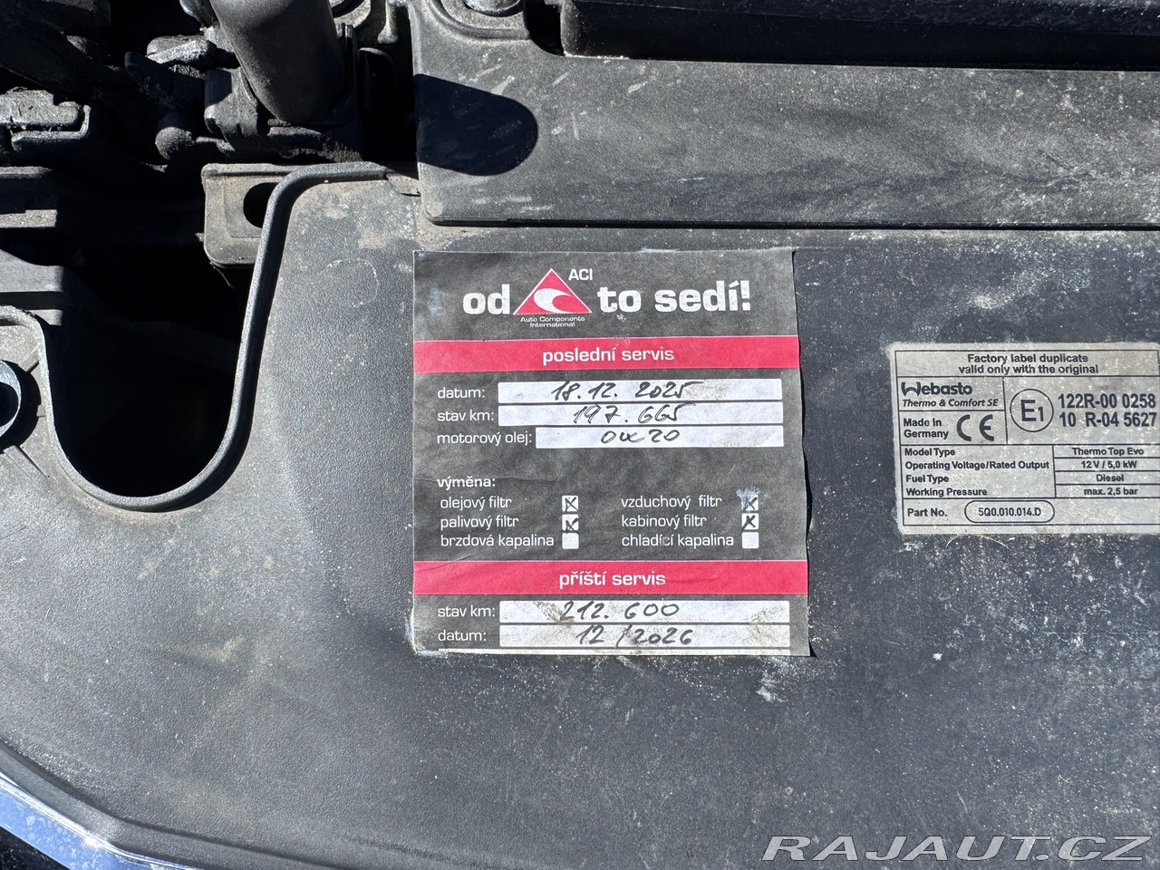 | Doplňující popis: | DRUHÝ MAJITEL, DVA KLÍČE+NEZÁVISLÉ TOPENÍ S DÁLKOU, NOVÉ CELOROČNÍ PNEUMATIKY, KOMPLETNÍ SERVISNÍ VÝPISY ZE ŠKODA AUTO, VÝSUVNÉ TAŽNÉ ZAŘÍZENÍ NA 2000KG, TŘETÍ SPZ PRO NOSIČ, DZ DO 12/2026, PŘI 200 TKM V ROCE 2025 MĚNĚNY ROZVODY+VŠECHNY OLEJE VČ. DSG+FA, VÝBAVA STYLE, SENZORY+KAMERA, PANORAMA, VIRTUAL KOKPIT, MULTIFUNCE, VÝHŘEV VOLANTU+VŠECH SEDADEL, AUTOMATIKA, LED, SKLOPNÉ ZRCÁTKA, USB, NAVI, BLUETOOTH, BEZKLÍČ, ANDROID, APPLE CARPLAY, 2X LOKET, OPĚRKA, PAMĚTI, ELEKTRIKA, PLATNÁ STK DO 9/2027, PŘI PRODEJI POMOHU S POJIŠTĚNÍM VOZU, K DISPOZICI CEBIA REPORT. Najeto: 201 198 km V provozu od: 9/2022 VIN: TMBJH7NP7N7053420 Klimatizace: Dvouzónová automatická Počet airbagů: 6 Počet dveří: 5 Palivo: Nafta Objem: 1 968 ccm Výkon: 110 kW (150 koní) Převodovka: Automatická Převodový stupeň: 7 stupňová Pohon předních kol Průměrná spotřeba: 1.7 l / 100 km EURO 6 Serv. knížka: Ano Země původu: Rakousko STK: 9/2027 ABS Airbag 6x Android Auto Apple Car Play Autorádio Bezklíčkové ovládání Bluetooth Centrální zamykání Dálkové centrální zamykání Dělená zadní sedadla Digitální přístrojový štít El. ovládání oken El. ovládání zrcátek El. ovládaný kufr El. parkovací brzda El. seřiditelná sedadla El. sklopná zrcátka Elektrické tažné zařízení ESP Imobilizér Isofix Klimatizace aut. Klimatizace dvouzónová LED matrixové světlomety Litá kola Mlhovky Multifunkční volant Nastavitelná sedadla Nastavitelný volant Natáčecí světlomety Nezávislé topení Originální autorádio Ostřikovače světlometů Otevíratelná střecha Pádla řazení na volantu Palubní počítač Pamět nastavení sedadla řidiče Panoramatická střecha Parkovací kamera Parkovací senzory přední Parkovací senzory zadní Podélný posuv sedadel Posilovač řízení Protiprokluzový systém kol (ASR) Přístrojová deska s barevným displejem Satelitní navigace Senzor opotřebení brzd. destiček Senzor stěračů Senzor tlaku v pneumatikách Start/Stop systém Střešní okno Tažné zařízení Tempomat USB Venkovní teploměr Volba jízdního režimu Vyhřívaná sedadla Vyhřívaná zadní sedadla Vyhřívaná zrcátka Vyhřívaný volant Výsuvné opěrky hlav Výškově nastavitelná sedadla Zadní loketní opěrka Zadní stěrač Závěsné zařízení v TP | |