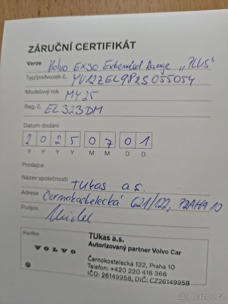 | Doplňující popis: | TEL: OKR: Prodám Volvo EX30 Extended Range PLUS, modelový rok 2025, koupené nové v ČR (Tukas Praha). Najeto jen cca 3 000 km, stav jako nové, garážované, bez poškození. Nabíjeno výhradně AC pomalu, nejčastěji do 80%, max. do 90 %, žádné DC – špičkový stav baterie. Kompletní dokumentace, záruční certifikát, COC, servisní kniha. Předplacený servis ještě 2 roky. Výbava: LED světla, 19' kola, parkovací kamera + senzory, vyhřívaná sedadla, navigace, Apple CarPlay/Android Auto, bezpečnostní systémy Volvo, bezklíčové odemykání, dvouzónová klima. Cena: 879 000 Kč – dohoda možná. Důvod prodeje: přechod na EX60. Možnost přepisu u autorizovaného prodejce. VIN: YV1KZEL98RS05054, | |
